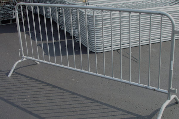 Durable Crowd Control Barrier. Easy Setup. Self-Supporting with Removable Feet. 8ft long x 44 inches high sections.