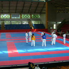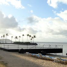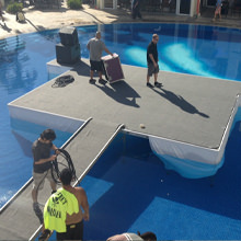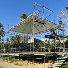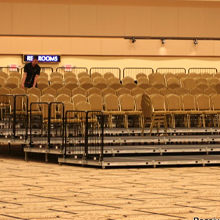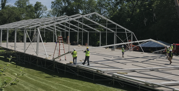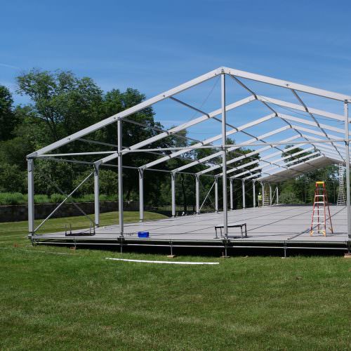 Elevated event tent flooring/understructure. Integrates with clear-span tents. Built-in tie-downs and tent upright shoring.